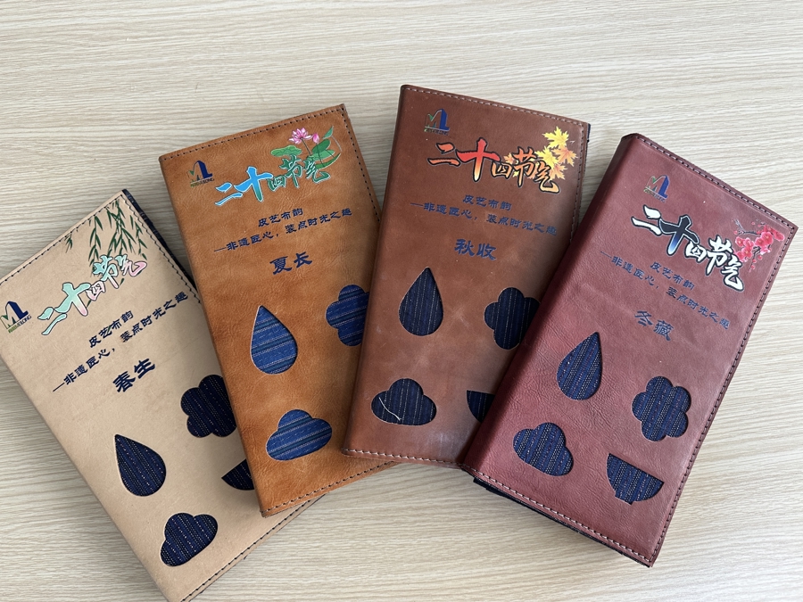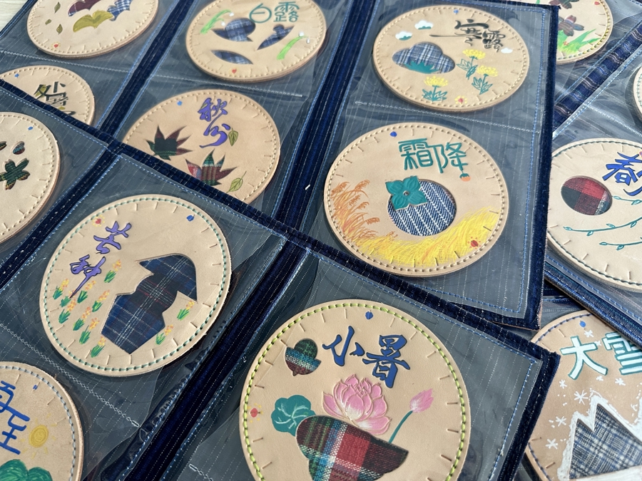 2024年,融合非遗皮艺布韵技艺的“二十四节气皮艺布韵”课程全新亮相,将节气民俗、物候与诗句转化为皮艺设计语言。例如,立春用花形刀模呈现“花开有序”,芒种以几何刀模刻画农耕场景,冬至用碗形刀模刻出一碗热气腾腾的饺子,展现团圆习俗。授课教师李伟介绍,内衬的老布颜色也有讲究——白露时蓝白相间,代表露珠的纯净;秋分时红绿相交,勾勒出枫叶的脉络。