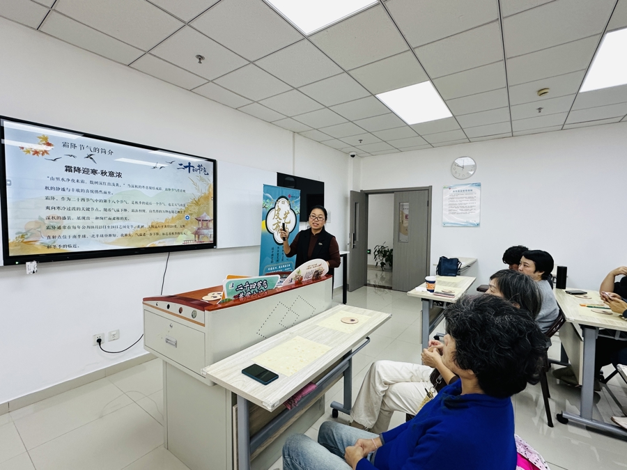 明日霜降,今天上午,一堂“二十四节气皮艺布韵”课在这儿开讲。