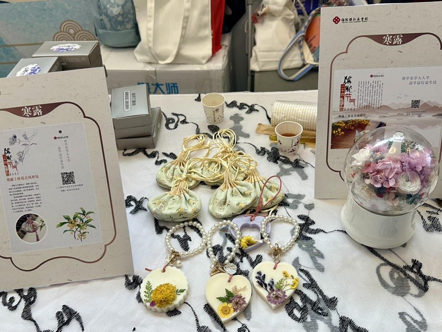 “二十四节气是一部自然辞典,一份人与自然的契约,更是一场中华民族与时空万物之间持续了几千年的智慧对话。”梅陇镇社区校长刘丽静介绍,从2021年起,梅陇镇社区学校邀请专业香道师、营养师、传统文化讲师和本校教师一起,创作了三套二十四节气系列课程,分别为“岁时花语,绽放生活之美”花艺制作、“顺应天时,涵养身心之源”养生手作、“养生膳缘,品味四季之味”饮食手作。立春,煮一壶姜枣桂葚红茶饮,做一把迎春花团扇,为朱砂养生梳添上一个梳挂,摇曳生风,也唤醒一年的神清气爽;雨水,烙一个五谷摄养做单饼,采摘樱花制成香氛蜡牌,再绘制一把缠绕画油纸伞,感受春风春雨的和煦浪漫;芒种,烧一道苦瓜酿肉,做一块金银花精油皂,再自制一瓶花露水,那是独属初夏的味道;白露,用银耳、百合、雪梨、川贝粉和冰糖煮一碗润燥五白羹,别一枚昙花古风发簪,将满地的银杏叶做成挂饰,凝固秋日美景;大寒,一壶核桃玫瑰炖茶梨、一个香雪兰花艺花篮、一个养生足浴包,用热烈色泽和香气,驱散冬日严寒……