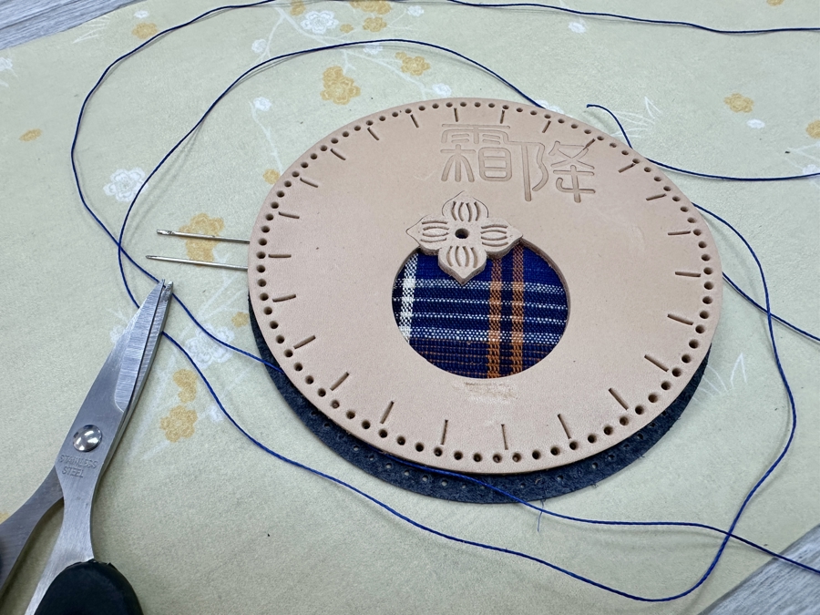 取两块直径12厘米的圆形牛皮,以植鞣牛皮为“面皮”,铬鞣牛皮为“底皮”。“面皮”上刻出图案,镂空部分衬上一块老布,采用交叉缝线法将两块皮料缝合紧实,再用丙烯马克笔涂色装饰……在老师指导下,一块块“霜降”主题杯垫在学员们手中诞生(下图)。