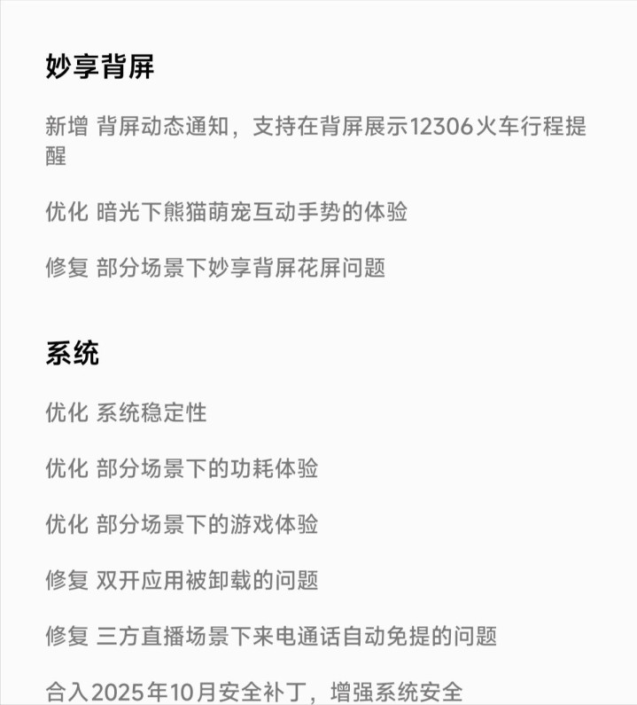 其二系统层面针对功耗和游戏场景作出调整,纠正双开应用可能被意外卸载、直播来电自动进入免提等问题,还整合了2025年10月的安全补丁,整体稳定性与安全性皆获提高。