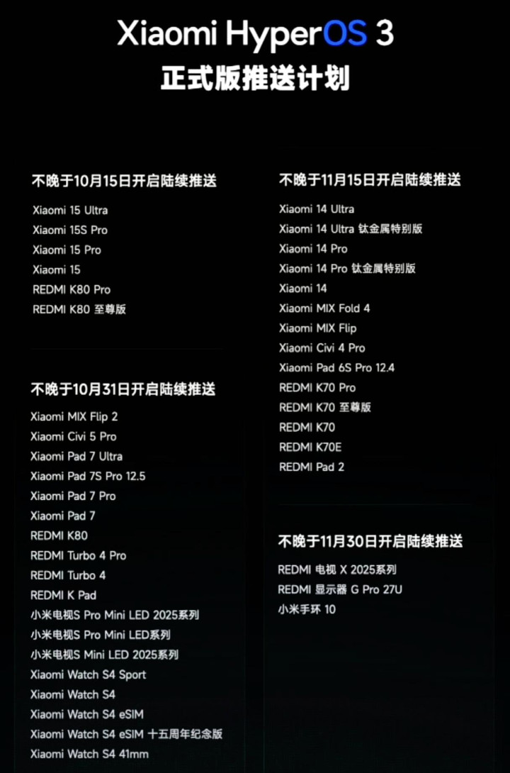 同时称会在10月15日前将该版本覆盖到小米15全系、红米K80Pro等首批机型。