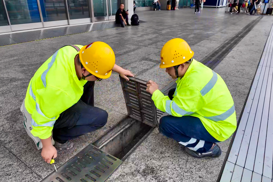 巡检聚焦进站口、站台、站房雨棚等区域,逐一排查风险点。在进站口,巡检人员手持工具清理排水沟内落叶、碎石等杂物,仔细核查排水口滤网完整性与排水坡度,确保雨水快速排出不淤积,避免旅客因地面湿滑发生意外。针对站台区域,工作人员借助照明设备逐块检查吊顶板拼接严密性与边角牢固度,同时确认内部龙骨结构稳定性,防止雨水渗漏滴落或吊顶变形脱落影响旅客安全。站房雨棚作为旅客候车及上下车的重要遮蔽设施,巡检人员登上车站屋面,认真检查屋面板密封情况与防风设施牢固性,杜绝大风降雨天气下出现面板松动、坠物等风险。